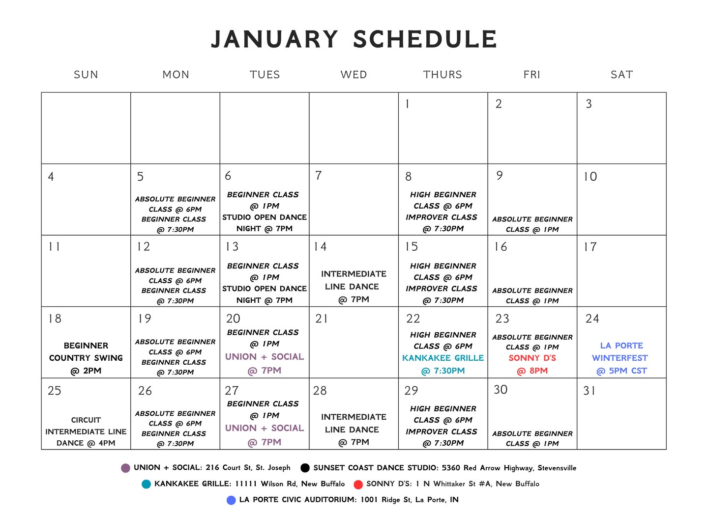 What Is Included: All Tuesday nights at Union + Social and any & all classes at the Sunset Coast Dance Studio!
